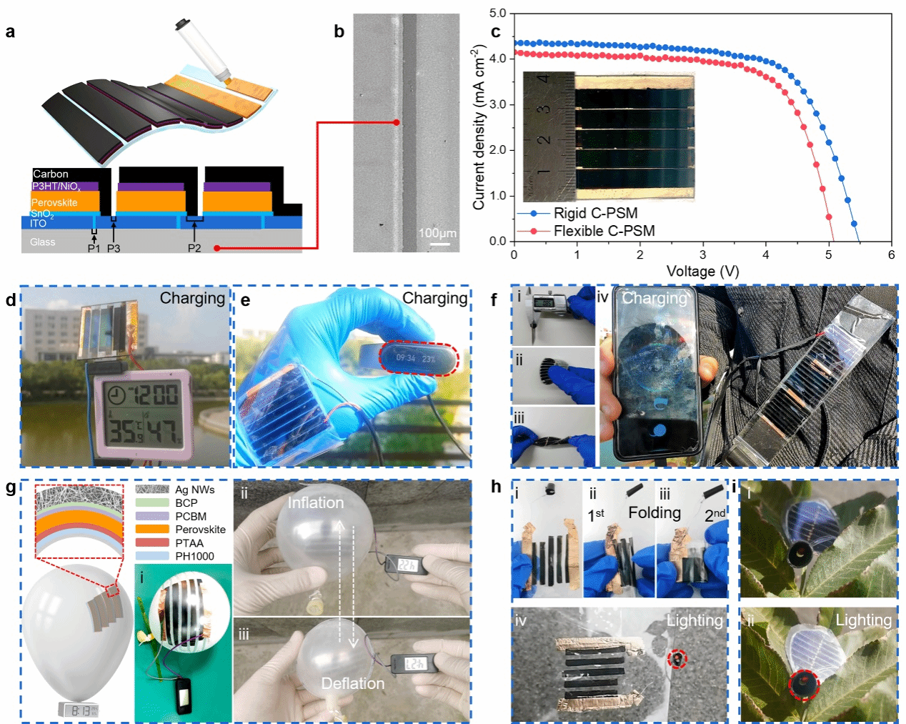溶液法制备的钙钛矿太阳能电池是低成本、轻量化及可穿戴电源的潜力之选,其制备工艺的便携性、可扩展性与图案化能力是应用推广与落地的关键。在此,谭付瑞教授团队提出了一种基于马克笔的大面积、可图案化、可循环钙钛矿薄膜书写技术。通过调控墨水浓度、书写压力、移动速度及笔尖宽度,结合马克笔的纤维毛细结构,实现了对钙钛矿胶体尺寸的均质化、薄膜厚度(200至>1000 nm)及图案面积(1至100+ cm²)的有效控制;进一步通过溶剂工程设计,可在常温环境下直接书写出结晶钙钛矿薄膜。基于上述无掩模、无激光工艺制作的马克笔书写碳电极钙钛矿太阳能组件,在刚性基底和柔性基底上分别实现了16.3%和14.5%的光电转换效率。该方法也为在不同物体表面(包括弹性气球,玻璃纸等)快速现场制备轻质、柔性可穿戴电源及异形光伏器件提供了新途径。