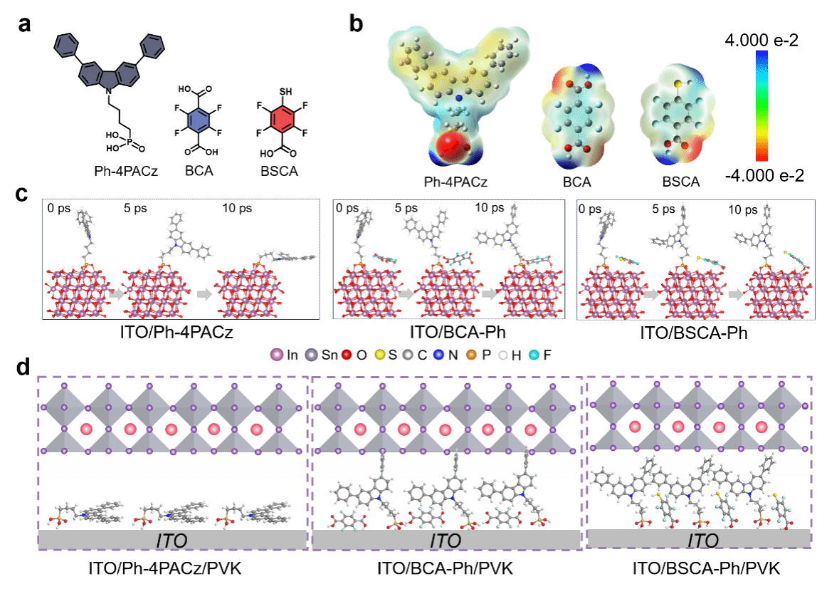 在前期工作基础上(Angew. Chem. Int. Ed. 2025, 64, e202424910; Adv. Funct. Mater. 2025, 35, 2424259; Nat. Commun. 2025, 16, 6968.)。近日,河南大学陈石团队在《Advanced Materials》期刊发表题为“Modulating Adsorption Configurations of Hybrid Self-assembled Molecules Enables High-performance Inverted Perovskite Solar Cells”的研究论文。该研究提出了通过共组装策略实现SAM取向调控的新方法。研究以[4-(3,6-二苯基-9H-咔唑-9-基)丁基]膦酸(Ph-4PACz)为主体SAM,引入2,3,5,6-四氟对苯二甲酸(BCA)与2,3,5,6-四氟-4-硫基苯甲酸(BSCA)作为共组装分子,利用理论模拟与实验验证相结合,系统揭示了共组装分子对Ph-4PACz取向、薄膜均匀性、能级排列及界面质量的影响机制。其中,BSCA的引入诱导Ph-4PACz分子由倾斜构型转变为近乎垂直排列(6.61°),显著提高了空穴传输层的致密性与能级对齐效果,改善了钙钛矿薄膜埋底界面的均匀性,增强了电荷传输并减少了界面非辐射复合损失。最终,基于BSCA-Ph的器件在小面积(0.0717 cm2)和大面积(1 cm2)下分别实现了26.72%(认证效率26.75%)和25.21%的高光电转换效率,并在连续光照1500小时和85°C加热1000小时后仍保持90%以上的初始效率,展现出优异的光热稳定性。该研究为改善SAM均匀性和堆积密度提供了重要指导,对钙钛矿光伏技术发展具有重要意义。